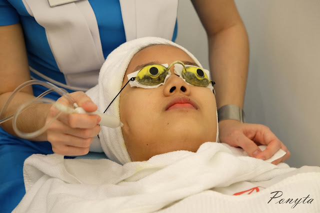 เริ่มฉีดละออกน้ำความดัน เพื่อให้หน้าชุ่มชื้นเข้าสู่ผิวได้อย่างลึกค่ะใส่แว่นเพื่อปกป้องตาไว้